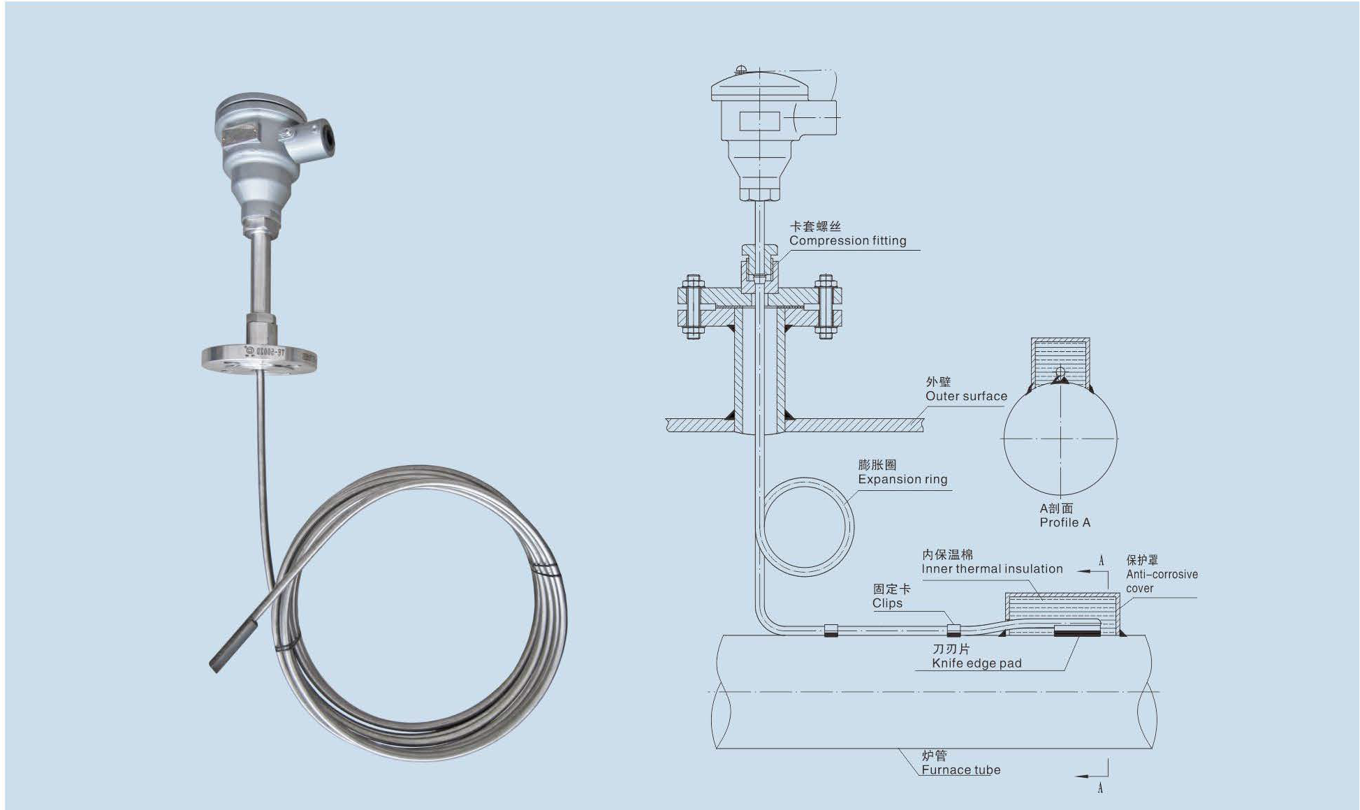主要測量加氫、催化裝置中的加熱爐管溫度,熱電偶通過刀刃片與爐管焊接,并設保溫罩,可以精確的測溫。